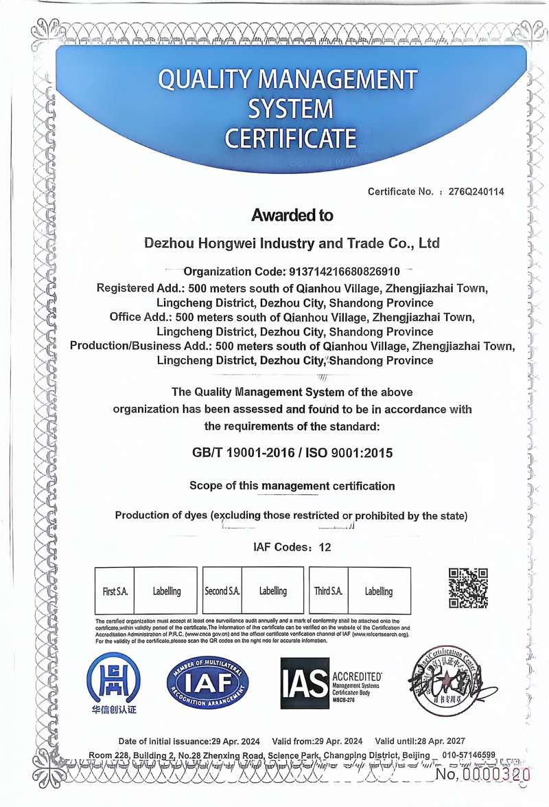 德州宏伟工贸有限公司,注册于2007年11月,注册资金500万元,公司坐落于陵县郑寨镇,104国道北侧,距京沪高速十公里,交通便利,是一个集专业生产酸性、直接、皮革染料为一体的新兴化工企业,主要产品有:酸性染料、直接染料和皮革染料。广泛用于皮革、纺织、印染、造纸等行业,年生产能力2000吨。产品出口欧洲、美洲、东南亚,等国家和地区以及国内多个省市。