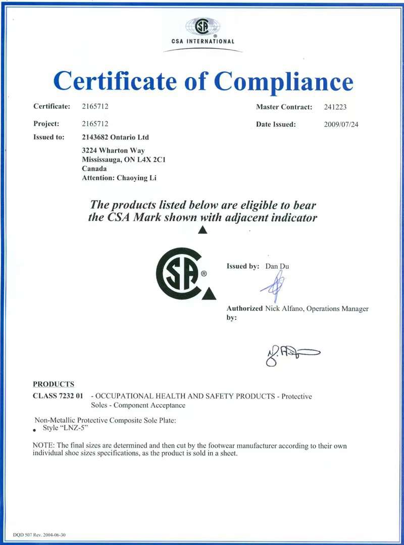 主要产品有钢鞋头、钢中底、塑料鞋头、复合鞋头及耐渗透非金属中底。所有产品均符合EN12568、CSA Z-195、GB/T12017-1989权威标准要求。