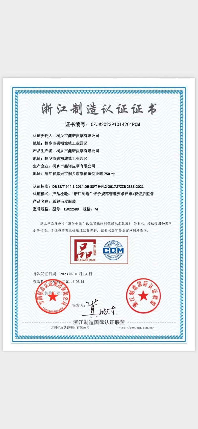 公司成立于2004年,位于中国浙江桐乡崇福镇城镇工业园区。公司占地面积50亩,生产厂房面积30000平米,拥有先进的皮草专业生产加工设备。通过数年的科学管理及技术积累,公司已经拥有一支精干的专业生产队伍,并拥有自行研发中心,设计生产加工能力已经达到硝染各类原料皮张貉子皮狐狸皮貂皮200万张、羊皮150万张、兔皮500万张等。公司毛皮服装制作规模已经达到年生产能力8—10万件,毛皮服装饰品制作能力50万件套以上。公司采用目前国际最先进的全环保鞣制工艺,生产的产品已经达到并超过国际最高的环保指标,真正做到绿色全环保。生产的产品远销欧美、日本、香港及国内的高端品牌。2005年成功通过了ISO9001:2000和质量管理体系认证;ISO14001:2004环境管理认证体系;2020年获环保部排污许可证。起草及参与了我国的行业标准:《毛革标准》 《貉子毛皮标准》 《皮革毛皮化学试验挥发物的测定》 《皮革毛皮化学试验氧化铬(Gr2O3的测定)》 《皮革毛皮化学试验戊二醛含量的测定》;起草及参与了国家标准:《皮革与毛皮化学试验游离脂肪酸的测定》 《貉皮》 《猾子皮》 《小湖羊皮》,目前有效发明及新型实用专利20余项,涉及到毛皮工艺、机械设备、化工材料,为整个皮草行业作出了贡献。