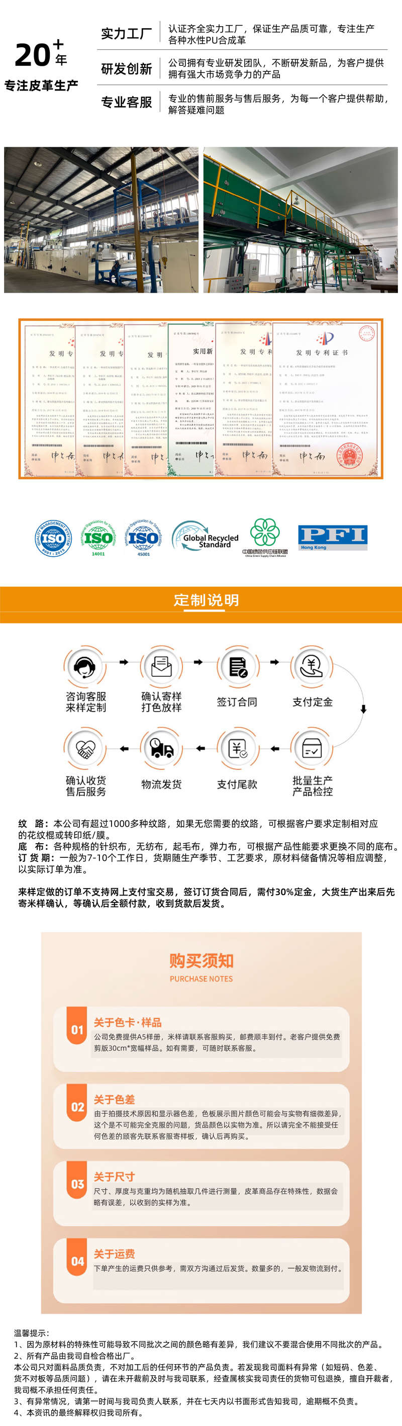 The company has passed ISO9001, ISO14001, ISO45001, GRS (Global Recycling Standard), PFI and other certifications, and the products have test reports issued by many international institutions such as SGS (REACH test report), BV (DMF-free test report). It can fully meet the environmental protection standards for synthetic leather at home and abroad.