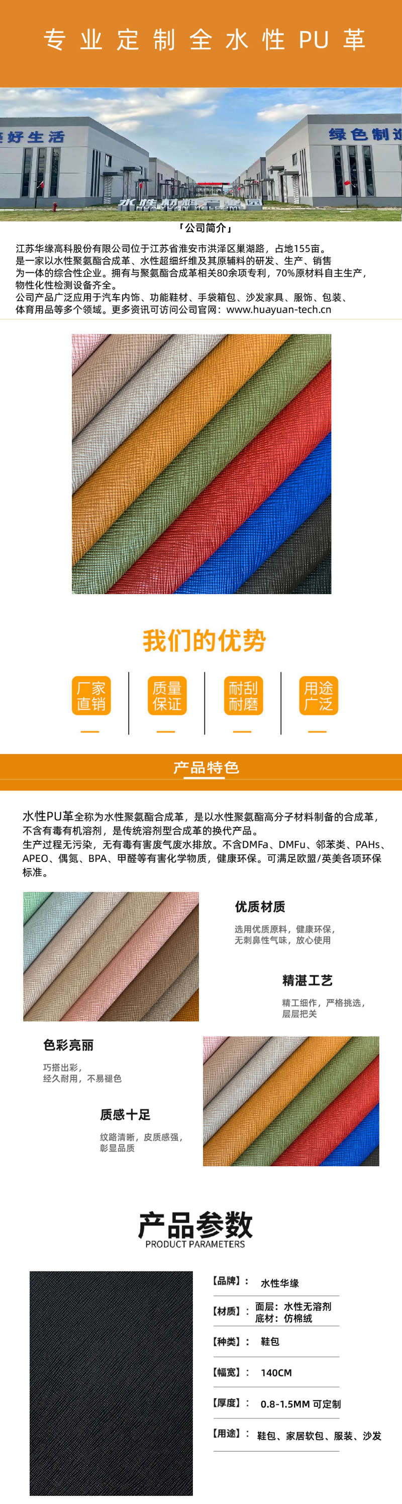 Jiangsu Huayuan Technology Co., Ltd. is located in Chaohu Road, Hongze District, Huaian City, Jiangsu Province, covering an area of more than 100,000 square meters. It is a comprehensive enterprise integrating R&D, production and sales of waterborne polyurethane synthetic leather, waterborne microfiber and its raw and auxiliary materials. It has hundreds of patents related to polyurethane synthetic leather, 70% of the raw materials are produced independently, and the physical and chemical property testing equipment is complete. The company's products are widely used in automotive interiors, functional shoe materials, handbags, bags, sofa furniture, clothing, packaging, sporting goods and other fields
