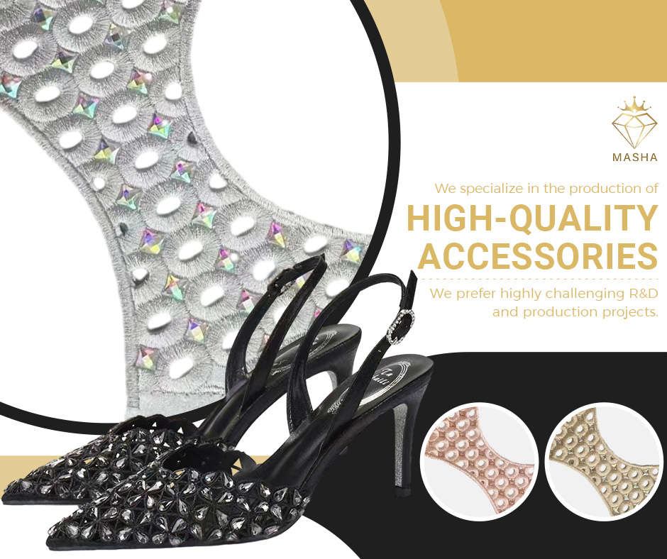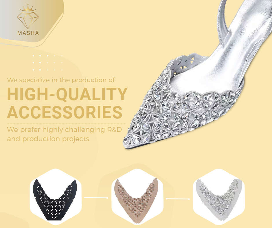 广州玛纱贸易有限公司,Masha专注于鞋类配饰的设计、开发和制造,总部设在中国广州,成立于2009年。我们的公司有着悠久的发展历史,我们已经拥有了一个庞大的高质量工厂网络,它们作为我们的合作伙伴和供应商。我们多样化的产品范围专注于鞋类配饰。