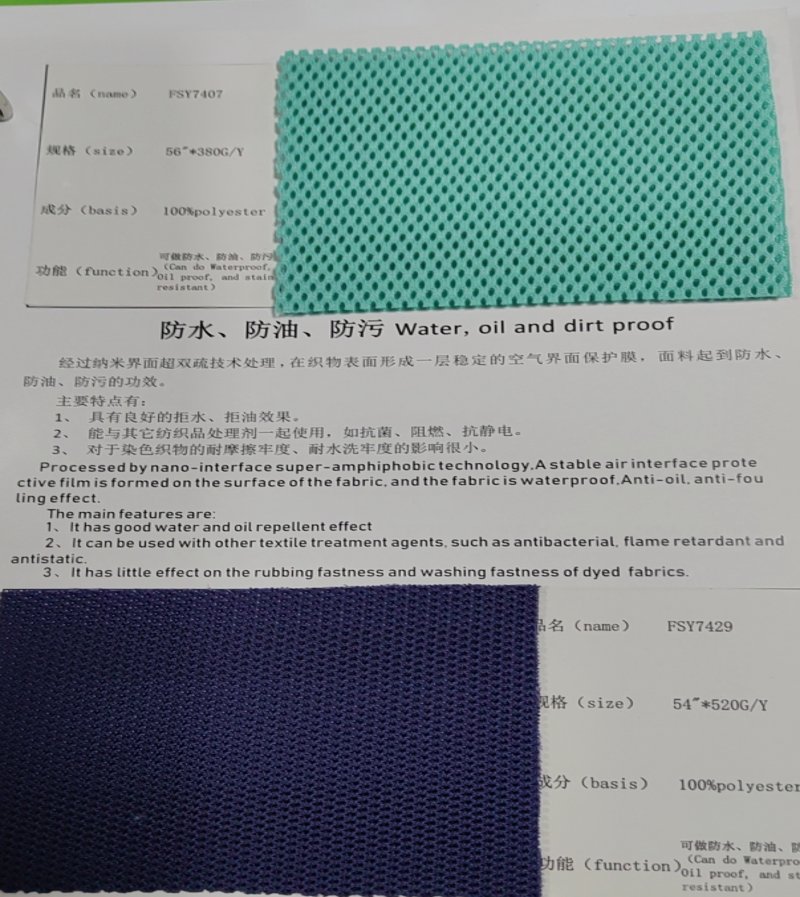 Processed by nano-interface super-amphiphobic technology.A stable air interface prote ctive film is formed on the surface of the fabric, and the fabric is waterproof.Anti-oil,anti-fou ling effect.