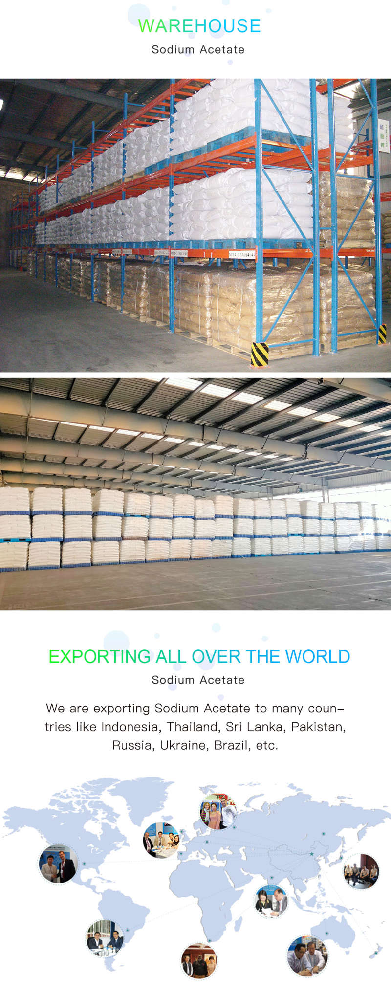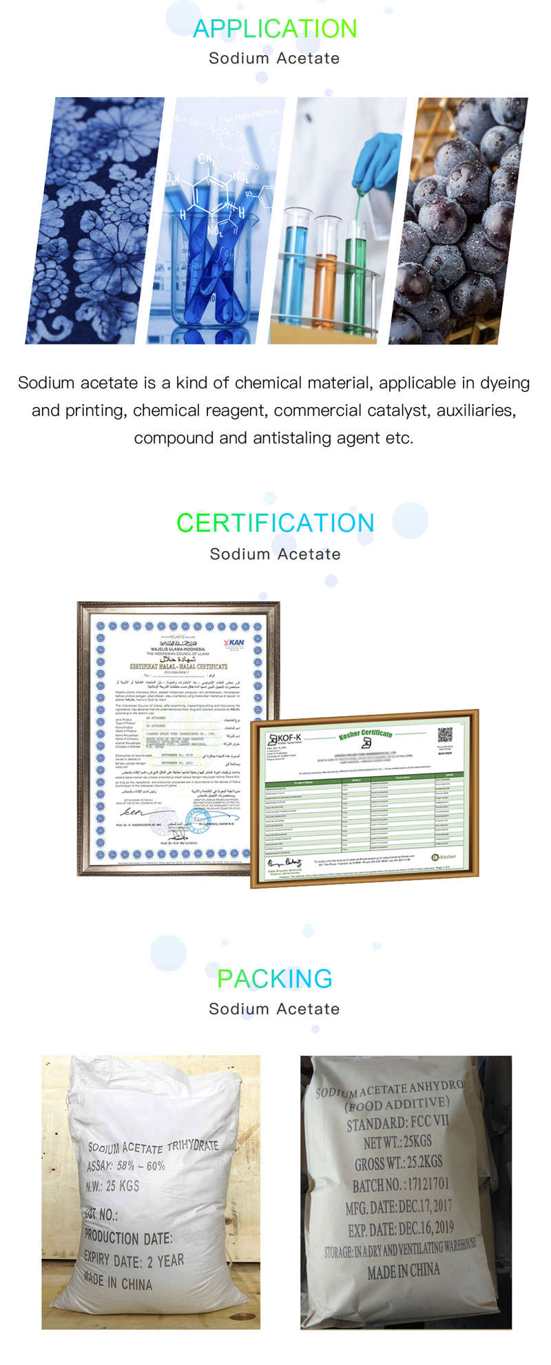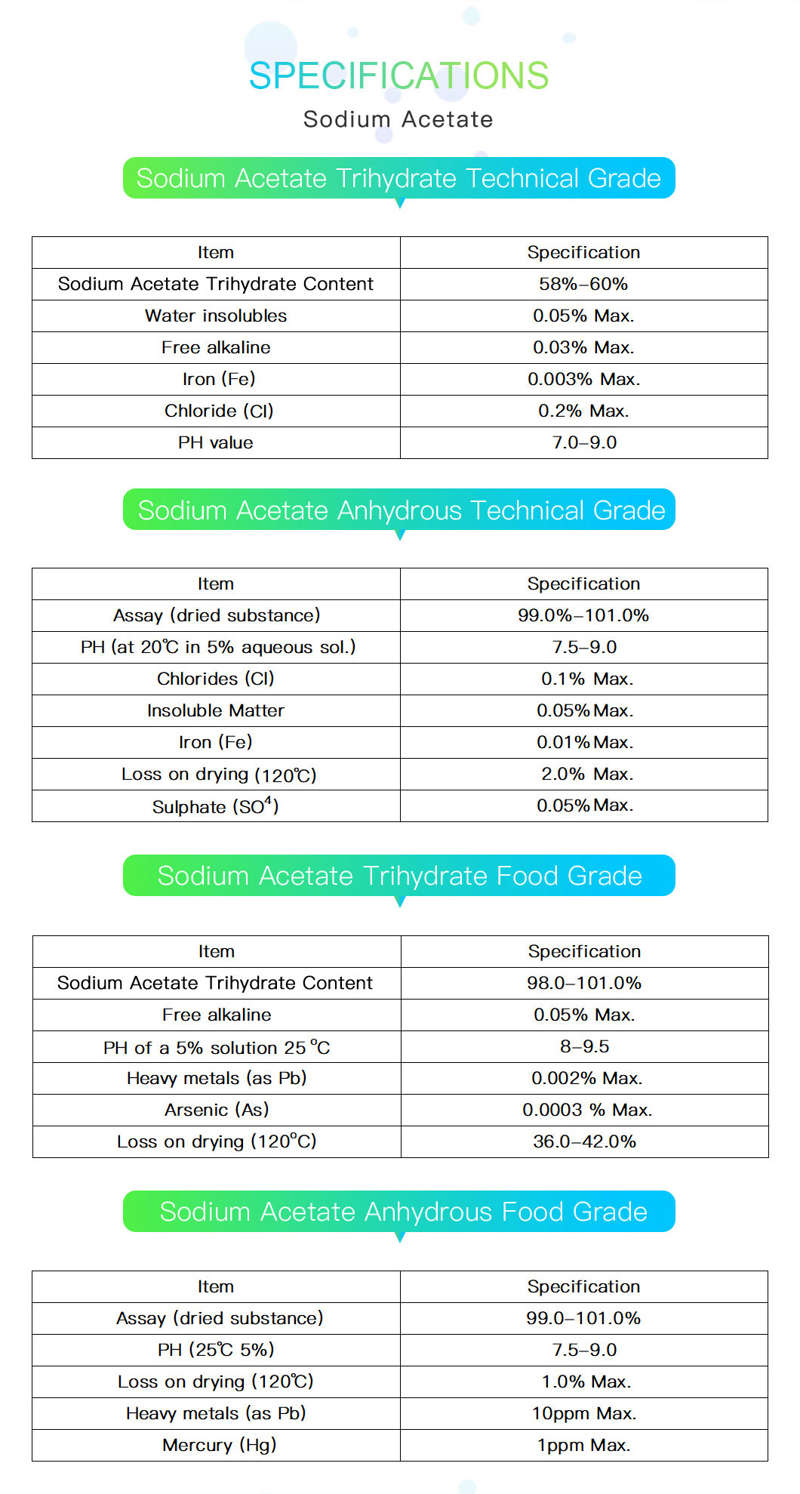 Very white, Small crystal, Easily soluble in water Sodium Acetate