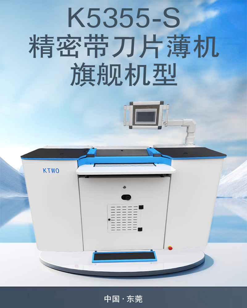 The K5355-S model is the flagship model of the KTWO precision blade thin machine series, with a super large working width of 520mm, widely used in genuine leather, PU, Microfiber, EVA, The whole sheet thin operation of materials in various industries such as rubber and plastic has the characteristics of uniform and stable cutting.