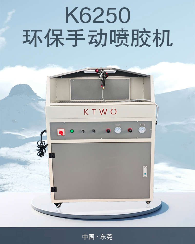 The environmentally friendly manual glue spraying machine independently designed and produced by KTWO can independently control functions such as power supply, lighting, fan, glue barrel pressure, atomization pressure, etc., making operation and maintenance simple and convenient. The model comes with filter cotton, which can effectively absorb and atomize excess glue, protecting the health of operators.